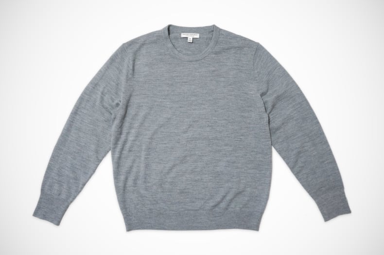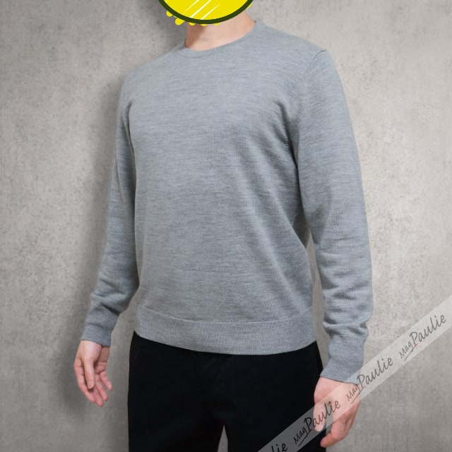 今回購入したのは「メリノ クルーネックセーター」のヘザーグレー (076)。杢グレーとも呼ばれる霜降り感のあるグレーですが、まあ要はライトグレーです。